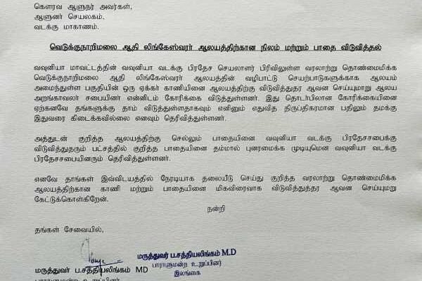 எனவே தாங்கள் இவ்விடயத்தில் நேரடியாக தலையீடு செய்து குறித்த வரலாற்று தொண்மைமிக்க ஆலயத்திற்கான காணி மற்றும் பாதையினை மிகவிரைவாக விடுவித்துத்தர ஆவன செய்யுமறு கேட்டுக் கொள்கிறேன் என குறிப்பிடப்பட்டுள்ளது.
